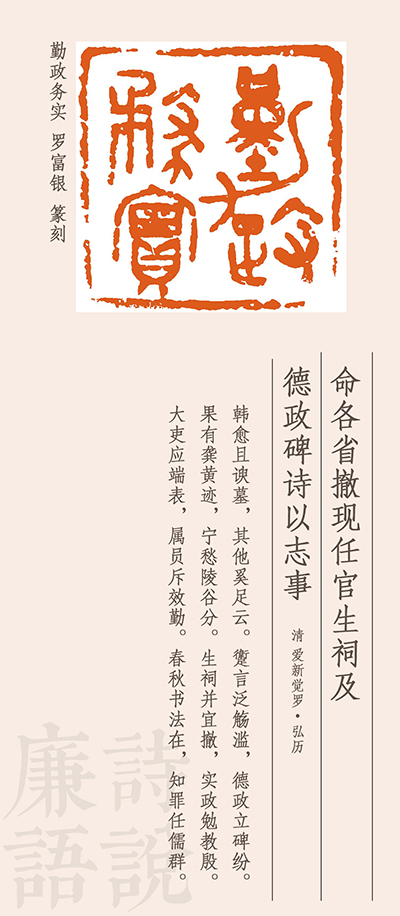 乾隆皇帝愛新覺羅·弘歷以一生作詩4萬余首名列古今詩人第一。其詩以記事為先,以議論為主,在文采上殊無可觀,但許多作品可以佐證史實(shí),故有“詩史”的功效。這首詩反映的是朝廷整頓吏治、崇實(shí)棄虛,指斥基層官員沽名釣譽(yù)、建祠樹碑的事。在今天依然有很強(qiáng)的現(xiàn)實(shí)意義。