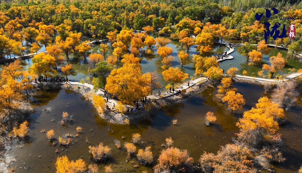 胡楊茂盛,疊翠流金,裊裊身姿倒影湖中。風一吹,樹梢輕顫,成千上萬片葉子像被點燃的火焰,在藍得沒有一絲雜質的天空下翻涌、跳躍,充滿詩意。林間小道上,游客悠閑漫步,盡享美好時光。