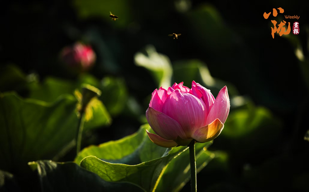 荷花成片盛開(kāi),偶有蜜蜂飛來(lái)飛去,時(shí)而駐足在花苞尖上,時(shí)而又快速飛向另一朵荷花,構(gòu)成了一幅靈動(dòng)的“蜜蜂戲荷圖”。水中的魚(yú)兒也不甘寂寞,穿梭在荷葉間,偶爾躍出水面,濺起朵朵水花,為這靜謐的荷塘增添了幾分生機(jī)。
