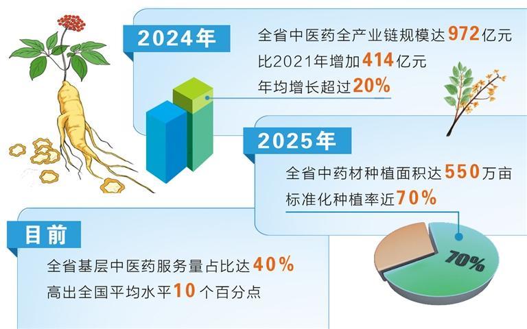如今,全省已建立起覆蓋省、市、縣、鄉(xiāng)的中醫(yī)藥服務體系,實現(xiàn)所有綜合醫(yī)院中醫(yī)藥服務全覆蓋,基層醫(yī)療衛(wèi)生機構中醫(yī)館全覆蓋,中醫(yī)適宜技術推廣使用全覆蓋,基層中醫(yī)藥服務量占比達40%,高出全國平均水平10個百分點,真正做到讓人民群眾“方便看中醫(yī)、放心吃中藥”。
