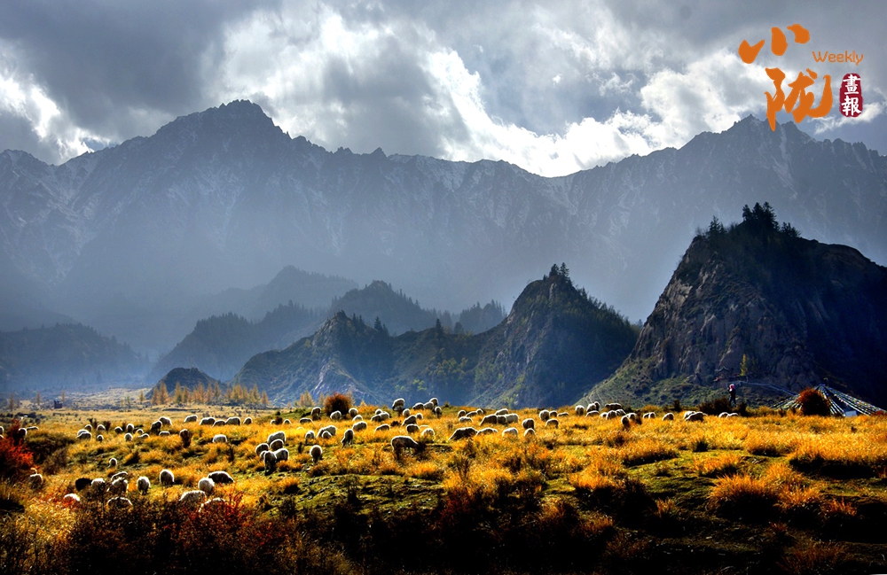 在這如詩如畫的風景中,陽光灑滿山間。遠處,群山環(huán)抱,云遮霧繞,景致壯觀。近處,羊兒悠然自得地覓食,為這片金黃的土地增添了幾分生機與活力。