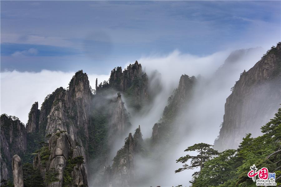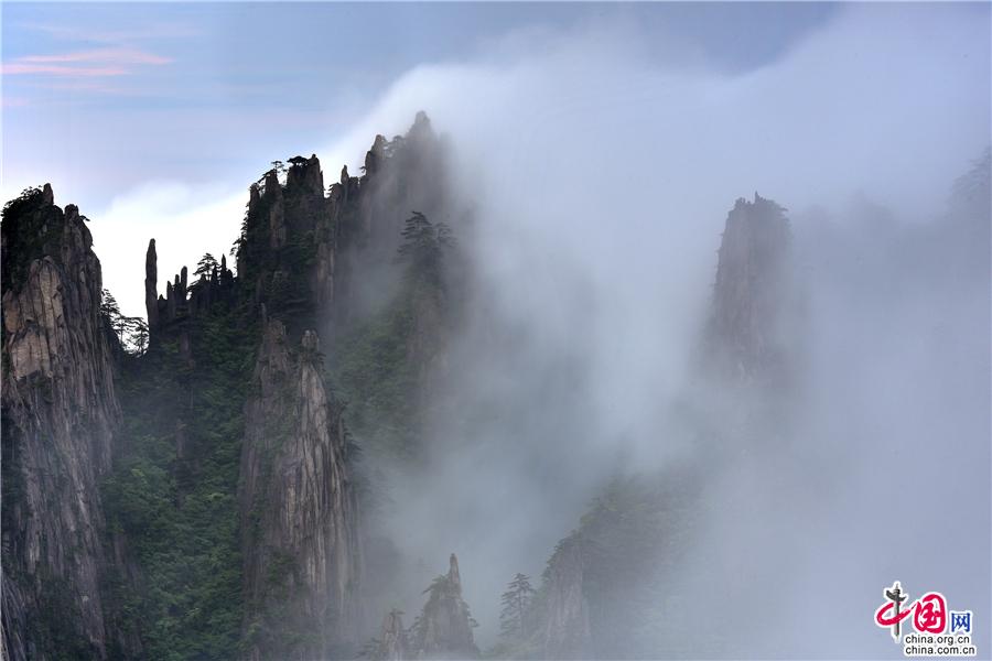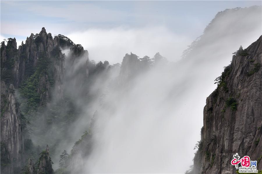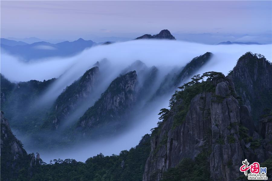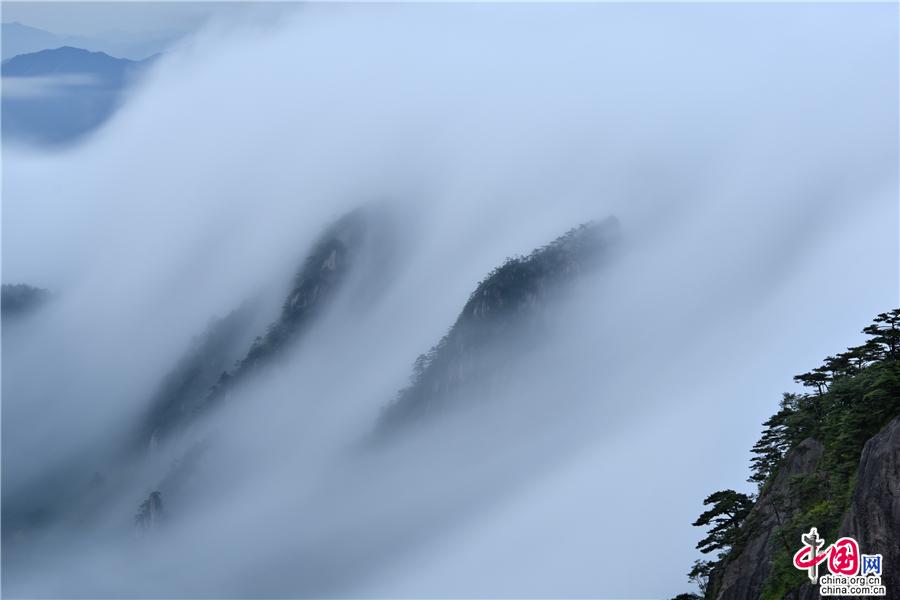 5月22日傍晚,雨后安徽黃山風(fēng)景區(qū)現(xiàn)壯觀的云海奇觀,見(jiàn)云海奔騰而來(lái),越過(guò)北海的始信峰,沿著群峰傾瀉而下勢(shì)如瀑布之壯觀,在奇群、怪石和形態(tài)各異黃山松的作用下勾勒出一幅幅流動(dòng)的水墨畫;黃山不僅是云霧之鄉(xiāng),更是中國(guó)傳統(tǒng)水墨畫的天然的素材。(姚育青)